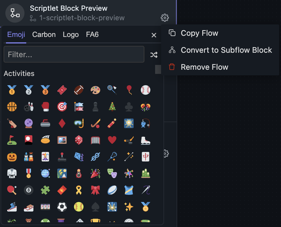 Clicking the left icon allows you to change the icon of this workflow, and clicking the gear icon in the lower right corner allows you to copy and delete it. The function of "Convert to Subflow Block" will be introduced in later sections.