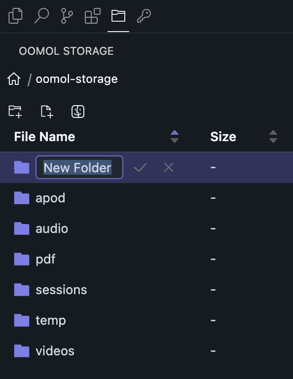 In the left sidebar, OOMOL Studio will show "Explorer" by default. You can also switch to other subviews as needed, such as: Search, Source Control (git), Extensions, OOMOL Storage, OOMOL Secrets.